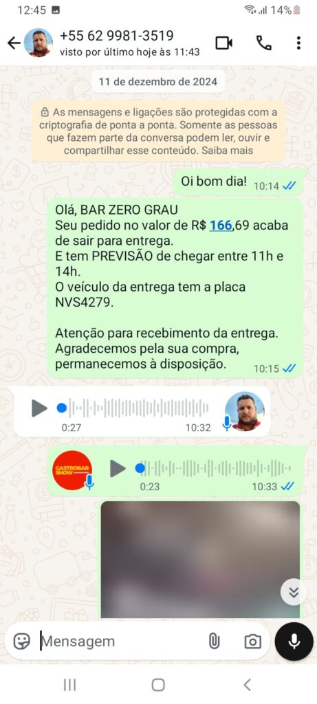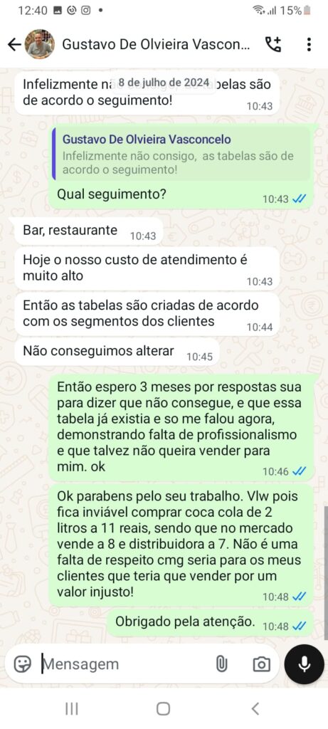Conversas whatsapp com o vendedor da Coca-Cola: Até então eu não sabia que o cadastro estava no CPF do meu pai e sim no CNPJ da empresa, ele respondeu com o áudio dizendo que foi um erro, informou o motivo do erro, pediu desculpas e disse que assumia as consequências.